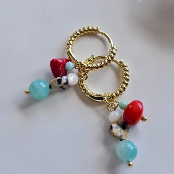 Tiene piedras naturales de cuarzo celeste de 6 mm y de 2 mm, escallón rojo coral, corazón de piedra natural de jaspe dalmata y nacar.
