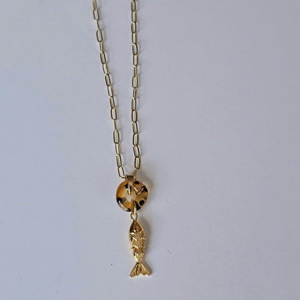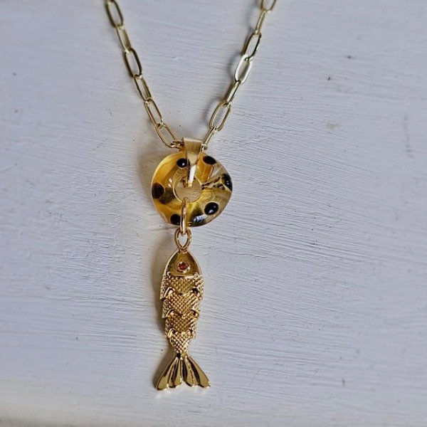 El dije es un pez de oro laminado 18k y una dona de vidrio murano artesanal de color print.