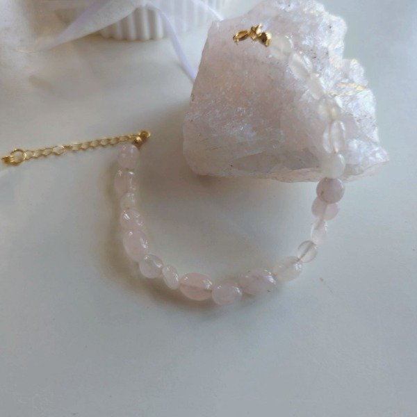 La pulsera está realizadacon piedras naturales de cuarzo rosa en forma de semillas irregulares. Las terminaciones son deoro laminado 18K.